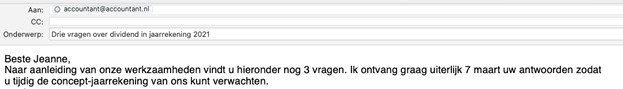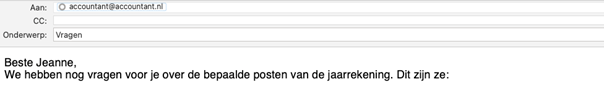 Stel, je ontvangt een e-mail van je accountant waarin hij je vraagt om bepaalde informatie aan te leveren. Hij opent de e-mail als volgt: